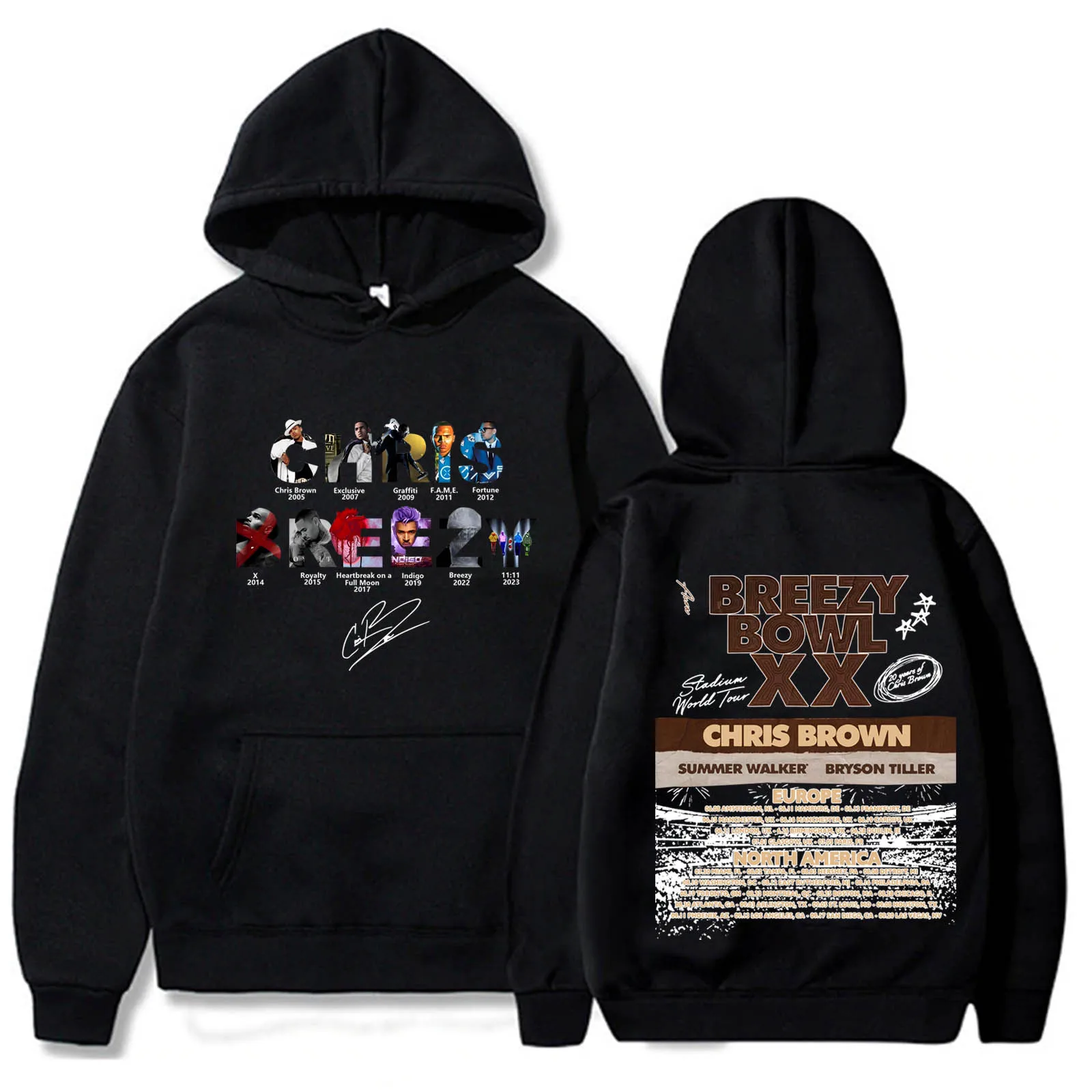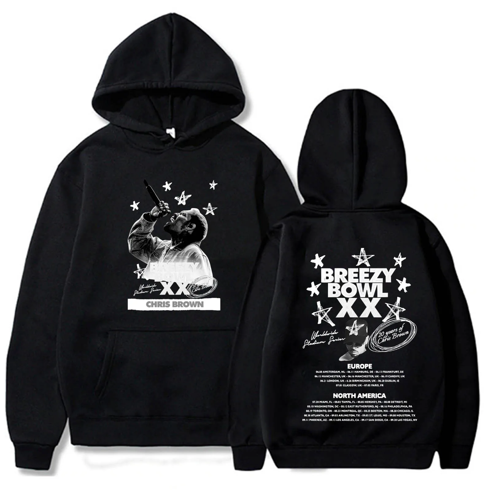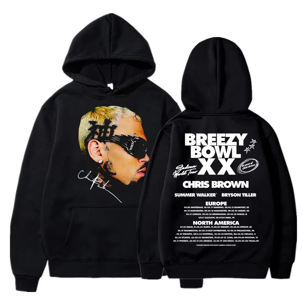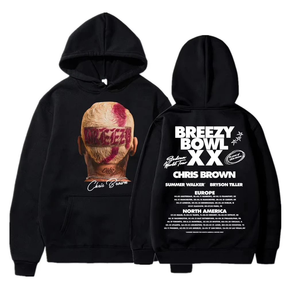 Celebrate the legacy of Chris Brown with this exclusive Breezy Bowl XX hoodie from his global stadium tour. Featuring a detailed portrait front and full tour stops on the back, this hoodie is a must-have for fans of Breezy, Summer Walker, and Bryson Tiller.