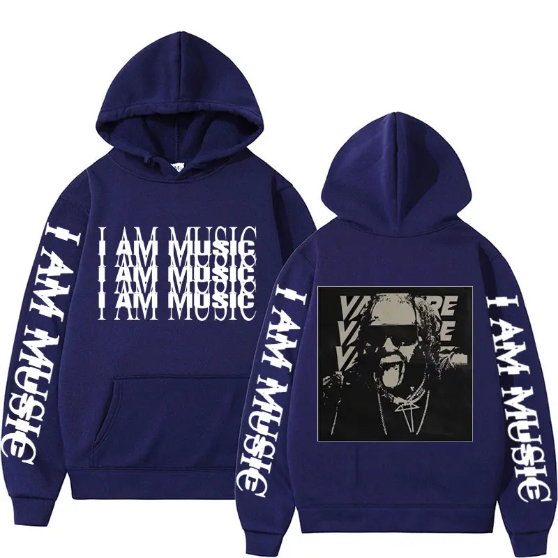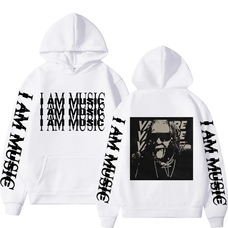Loud, unapologetic, and built for the street. This “I AM MUSIC” hoodie pairs disruptive sleeve graphics with a bold photo-back design that channels punk, rap, and vamp energy. A perfect crossover piece for fans of artists like Playboi Carti, Destroy Lonely, or any alt-rap icon with a rebellious edge.