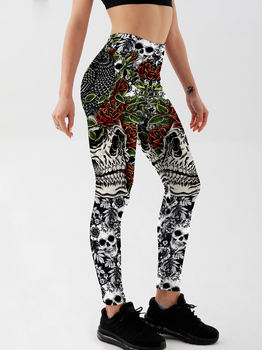 Don’t just wear leggings—make a statement that lingers. Click “Add to Cart” now and let your legs tell a story with these mesmerizing leggings with pink flower rose and skull artwork.