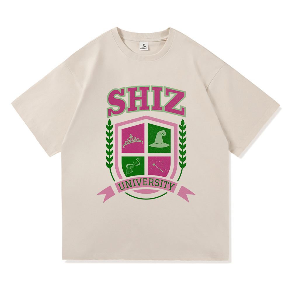 This beige t-shirt showcases a vibrant collegiate-style crest with the words “SHIZ UNIVERSITY,” referencing the fictional school from Wicked. The crest features four emblems — a tiara, witch hat, potion bottle, and magic wand — all representing iconic elements of Elphaba and Glinda’s origin story.